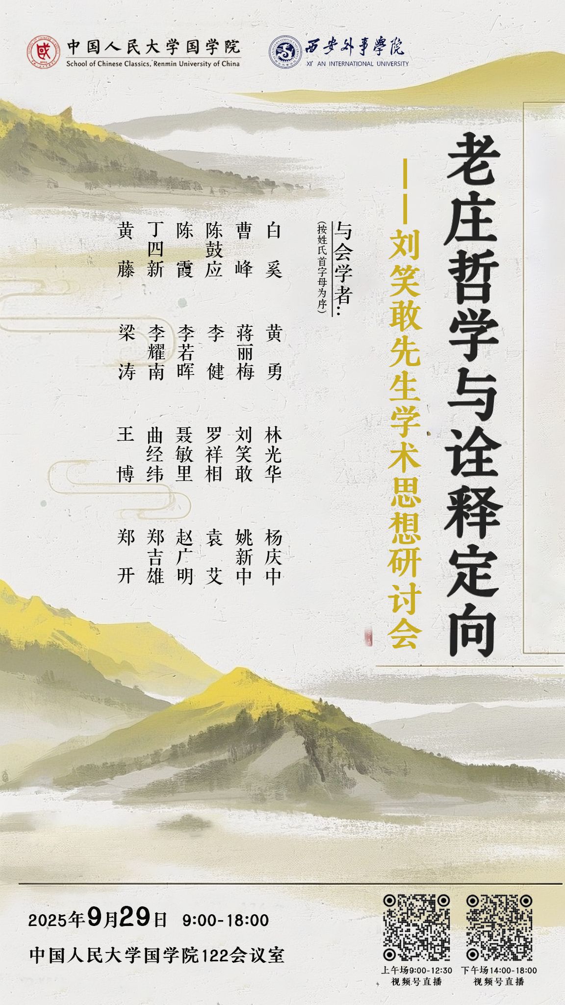 2025年9月29日,“老庄哲学诠释定向——刘笑敢先生学术思想研讨会”在中国人民大学举办,本次会议由中国人民大学国学院主办,共有20余名专家、学者参会。会议围绕刘笑敢先生的诠释方法展开,北京大学陈鼓应教授、王博教授,清华大学丁四新教授,中国人民大学曹峰教授,香港中文大学黄勇教授,中国社会科学院陈霞研究员等进行主旨发言,中国人民大学国学院院长杨庆中教授、西安外事学院校长黄藤教授致辞,会议由中国人民大学梁涛教授等主持。